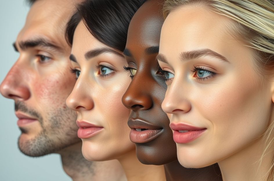 **Rosacea:** Often mistaken for acne, rosacea primarily affects adults between 30 and 60. Unlike acne vulgaris, rosacea does not involve comedones and appears on areas that flush easily. The skin is bumpy, red, and oily, and may involve papules and pustules. Early treatment is essential to prevent chronic inflammation and scarring.