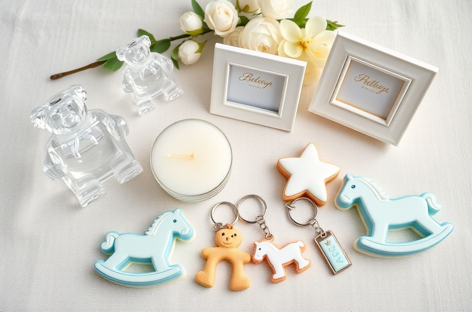 **Baby Cookie Cutter Sets:** This favor set includes a rocking horse, teddy bear, and bottle-shaped cookie cutters. Guests can use these to create sweet treats, fondly recalling the baby shower with each batch of cookies.